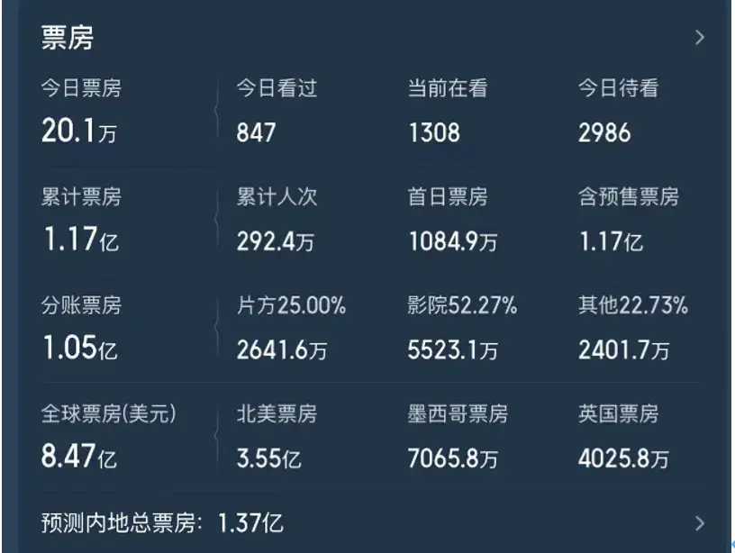 但另外一部大IP的电影《超级马力欧银河大电影》就有点尴尬了,内地票房1亿多,但全球票房高得吓人,直接飙升到了8.47亿美元,也就是58亿人民币。